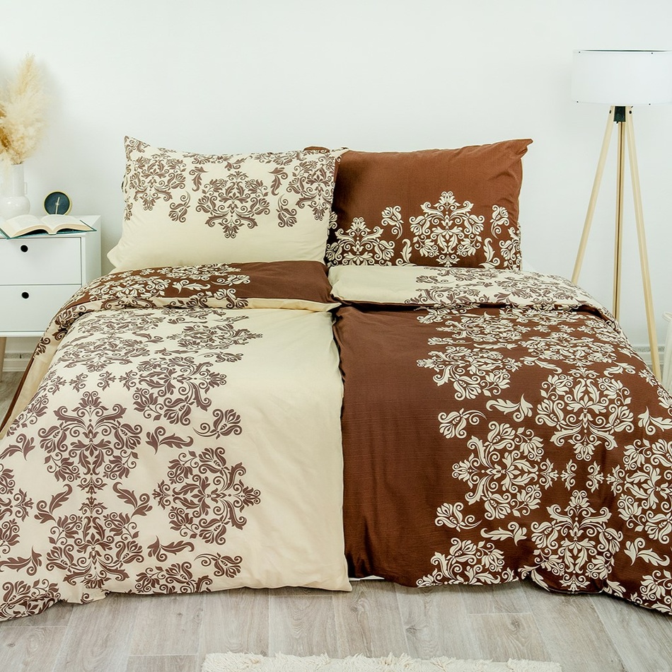 Rafinovanosť a pôsobivý dizajn na dokonale zladených obojstranných obliečkach. S týmto obojstranným vzorom môžete ľubovoľne meniť vzhľad. Nové moderné trendy v hnedej a béžovej farby vnesú energickú atmosféru do vášho interiéru. Obliečky perte naruby, bez bielidiel a chemických čistidiel. Súprava obsahuje: